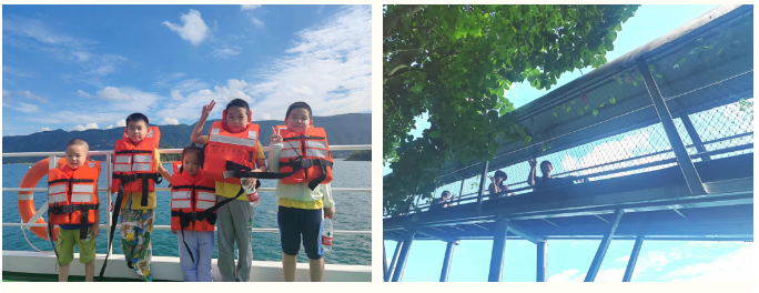 7月20日清晨,团队乘船游览仙岛湖,碧波荡漾的湖面送来阵阵清爽,形态各异的岛屿构成天然画卷,湖面清凉的微风拂去暑气,让人心旷神怡。全员身着救生衣有序登船,家长将孩子护在怀中,共同聆听导游讲解 “望仙崖”“观音洞” 等景点的传说故事,亲子间的温馨低语与惊喜赞叹交织成动人风景。